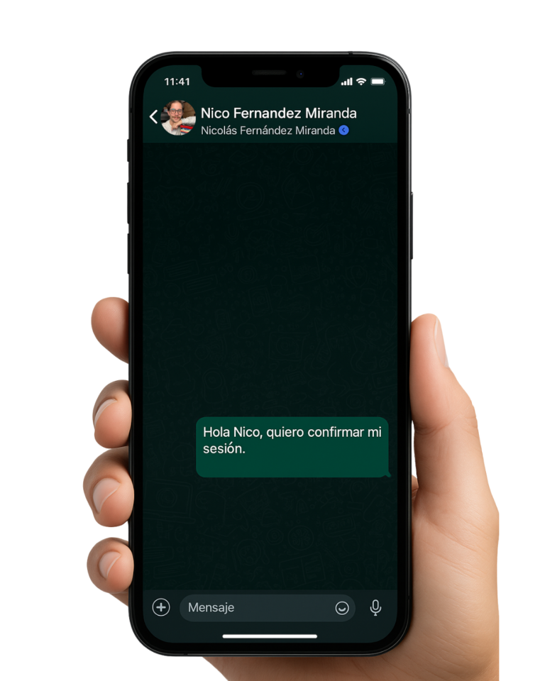 Es importante que valides tu sesión por WhatsApp, ya que solo trabajamos con personas comprometidas con su proceso y para asegurarnos de que sea una reserva real, y no una agenda automática o un bot. Si no la activás, tendremos que cancelarla.